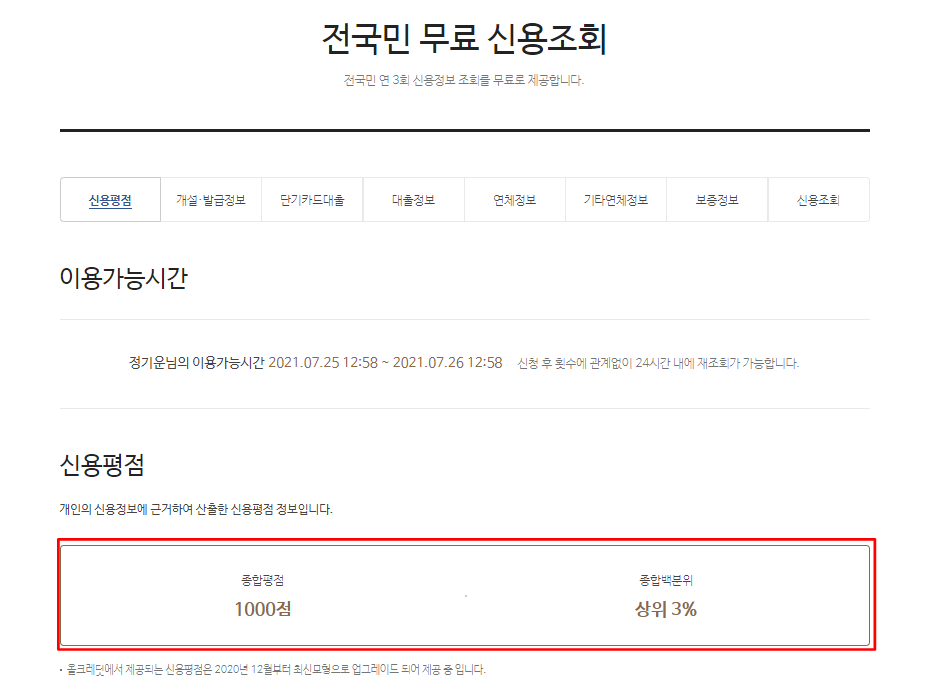 올크레딧은 전국민에게 무료 신용조회 서비스를 제공하고 있습니다. 1년에 4개월 마다 1번씩 총 3회 무료로 조회 가능하며, 그 이상 조회를 원할 경우 요금을 내고 조회해야 합니다. 신용조회는 비회원으로도 이용가능하며, 신용등급 이외에도 대출, 연체, 카드 발급 내역 등의 조회가 가능합니다.