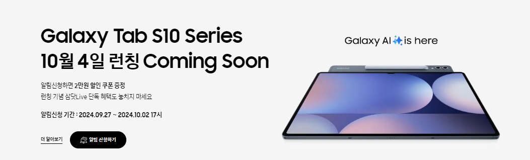 갤럭시탭 S10 시리즈의 공식 출시일은 2024년 10월 4일입니다. 보통 사전예약 기간 중에는 다양한 혜택과 추가 사은품을 받을 수 있기 때문에 빠르게 예약하는 것이 좋은데요.