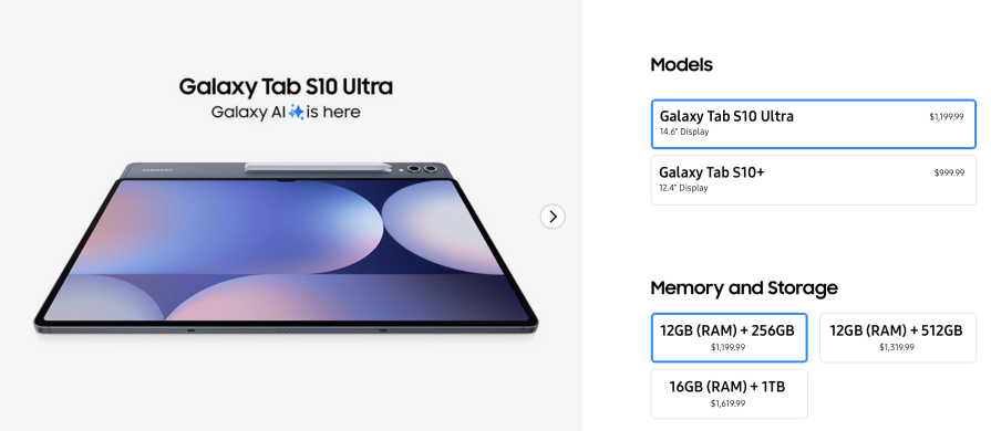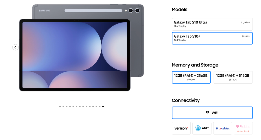 - 제품 선택: 갤럭시탭 S10 시리즈 중 원하는 모델(S10 플러스 또는 S10 울트라)과 용량을 선택합니다.