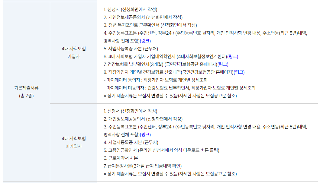 제출서류는 4대 사회보험 가입자와 미가입자에 따라서 약간 차이가 있는데요. 먼저 4대 사회보험 가입자가 제출해야 할 기본 제출서류부터 살펴보면 아래와 같습니다.