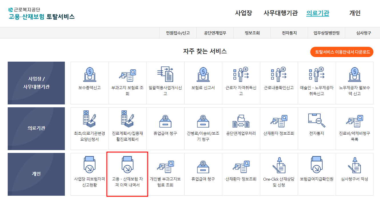 2) 자주 찾는 서비스 메뉴에서 고용, 산재보험 자격 이력 내역서를 클릭합니다.