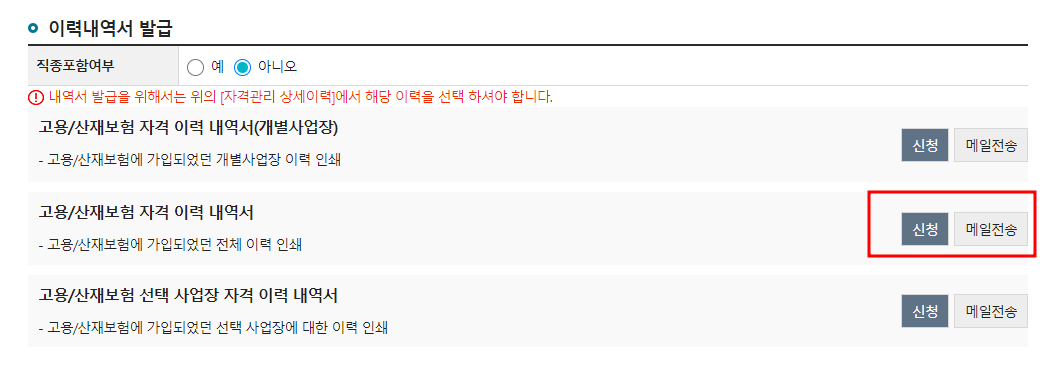 4) 고용보험 가입이력 조회가 필요한 사업장을 선택 후 이력내역서 발급 신청을 합니다.