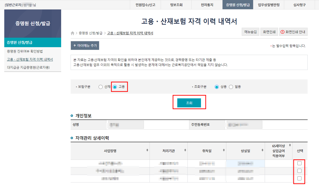 3) 보험 구분에서 고용 선택 후 조회합니다.