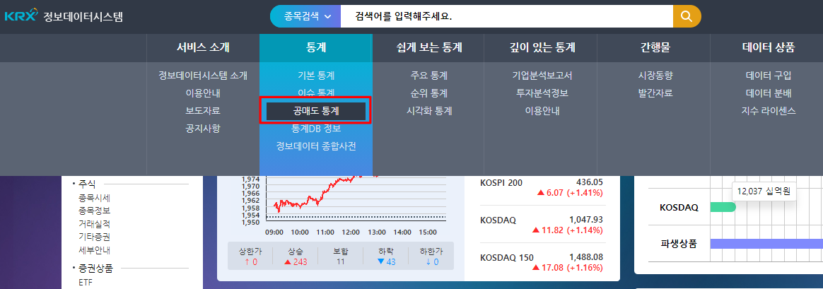 KRX정보데이터시스템에 접속하여 상단 메뉴에서 공매도 통계를 클릭합니다. 그리고 좌측에 공매도 잔고, 개별종목 공매도 잔고를 누르면 공매도에 대한 데이터를 볼 수 있습니다.