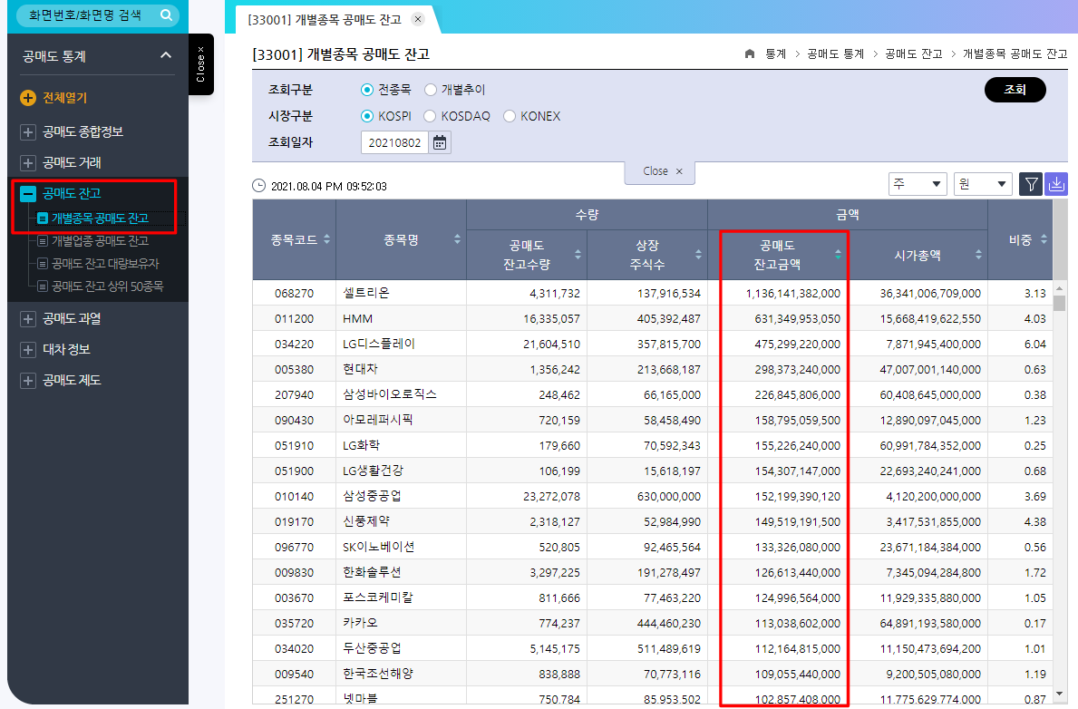 하지만 코스피 지수가 3200선이 넘을 정도로 시장 상황이 좋아도 자금력과 정보력이 강한 기관과 외국인이 마음먹고 공매도를 해버리면 주식을 보유하고 있는 개인은 속수무책으로 손실을 볼 수 밖에 없습니다. 만약 공매도로부터 영향을 덜받기 위해서는 주식 투자를 할때 처음부터 공매도 상위종목을 확인하는 방법이 있습니다.