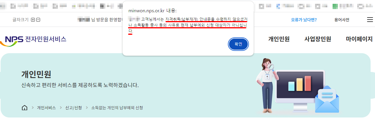 자격취득 안내문을 수령받지 않은 분들은 신청대상자가 아니라는 확인창이 보이실텐데, 이 경우에는 공단에 직접 방문 또는 전화, 팩스, 우편 등을 통해서 납부예외를 따로 신청해야 합니다.