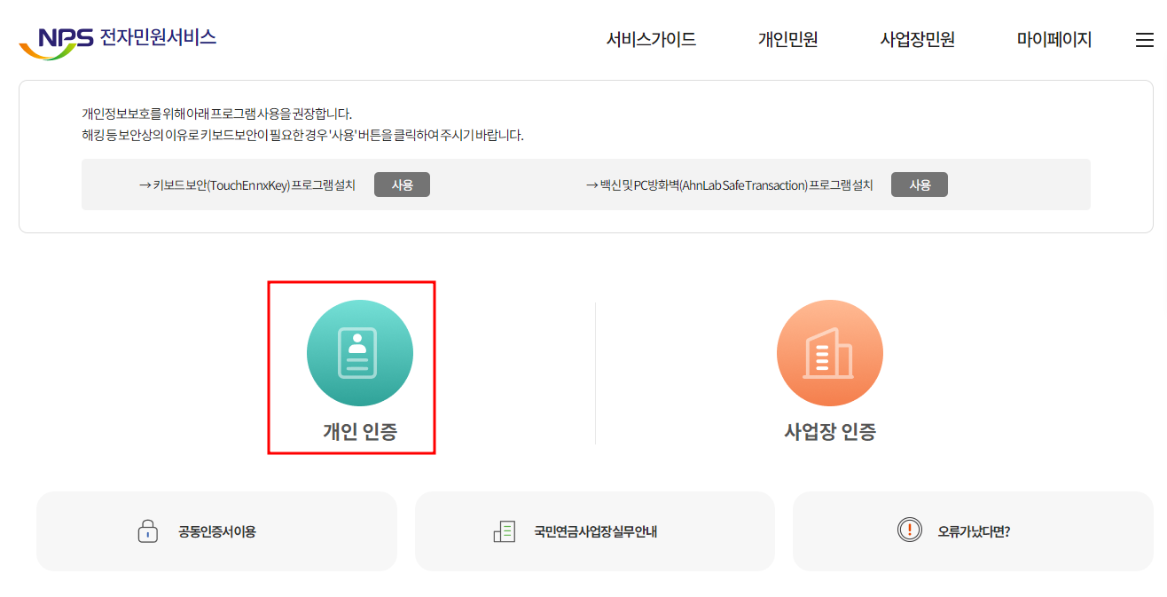 1) 국민연금공단 전자민원서비스 홈페이지에 접속합니다.