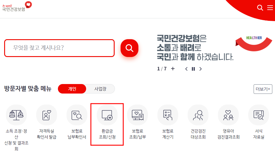아래 주소를 통해 건강보험공단 홈페이지에 접속해서 국민연금 환급금 조회/신청을 통해서 신청할 수 있습니다.