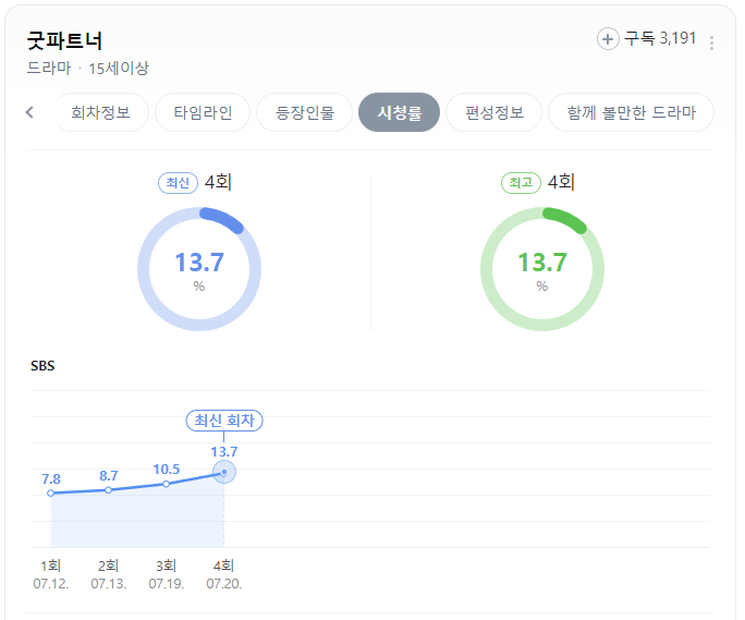 굿파트너는 첫회 시청률 7.8%로 시작하여 매회마다 뚜렷한 시청률 상승을 보이더니, 어제 4회차 시청률은 무려 13.7%를 기록했는데요.