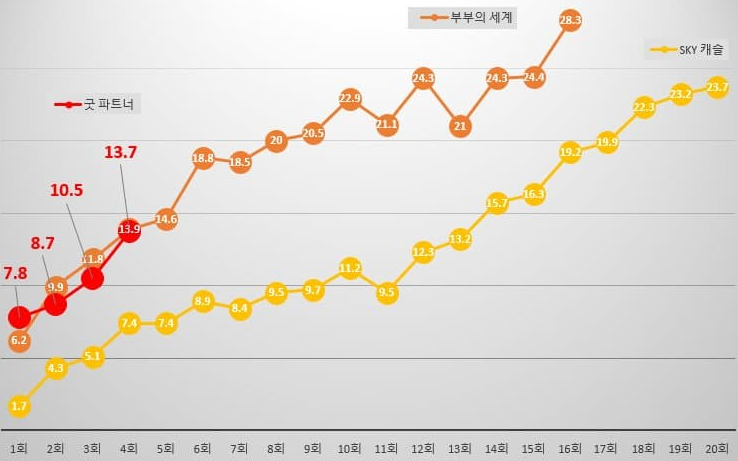 이 기록은 예전 부부의 세계 4회차 시청률과 거의 비슷한 추이입니다. 당시 부부의 세계는 시청률 20%를 넘어 마지막 회차에는 28%를 넘기는 엄청난 기록을 세운바가 있기에 앞으로 굿파트너 기록도 기대가 되는 상황인데요.