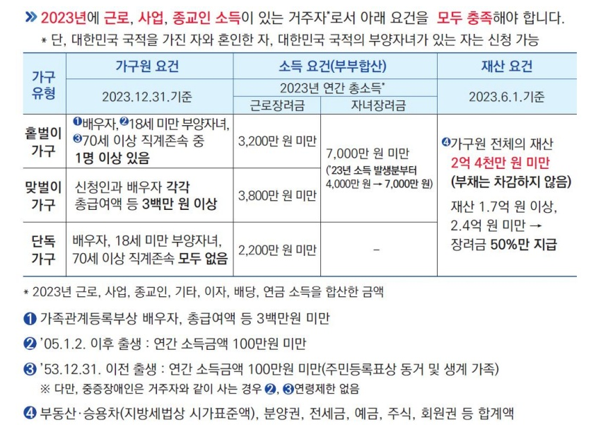 - 단독 가구: 부부합산 소득이 2,200만 원 미만