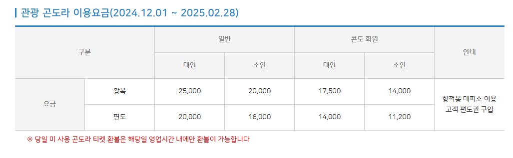 겨울시즌 덕유산 곤도라 요금은 다음과 같습니다.