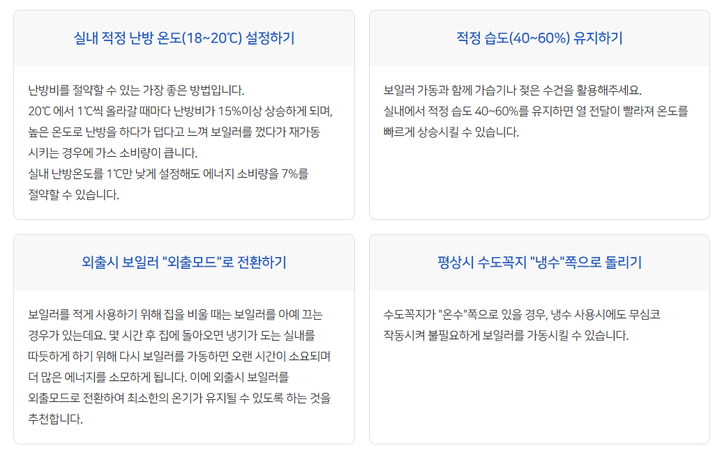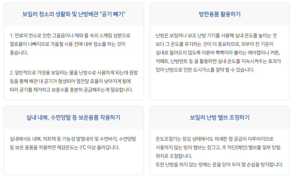 - 효율적인 난방기 사용: 오래된 보일러는 주기적으로 점검 및 교체.