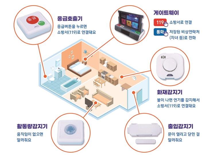 독거노인 장애인 응급안전알림 서비스는 독거노인과 장애인 가정에 화재 및 가스 감지기, 활동량(심장 박동수와 호흡) 감시 장치, 그리고 응급 호출 기능을 설치함으로써, 그들이 처할 수 있는 위급 상황을 신속히 감지하고 이에 대응할 수 있도록 안전 체계를 구축하는 서비스입니다.