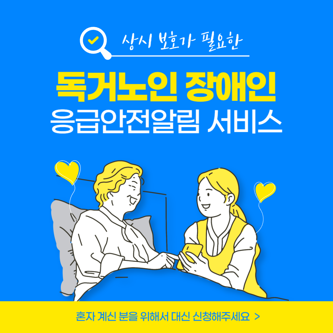 독거노인 뿐만 아니라 상시 보호가 필요한 장애인도 해당 서비스를 신청할 수 있으니 필요하신 분 또는 자녀 분들은 혼자계신 부모님 안전을 위해 대신 응급안전알림 서비스를 신청해서 만일의 응급상황을 대비해보시기 바랍니다.
