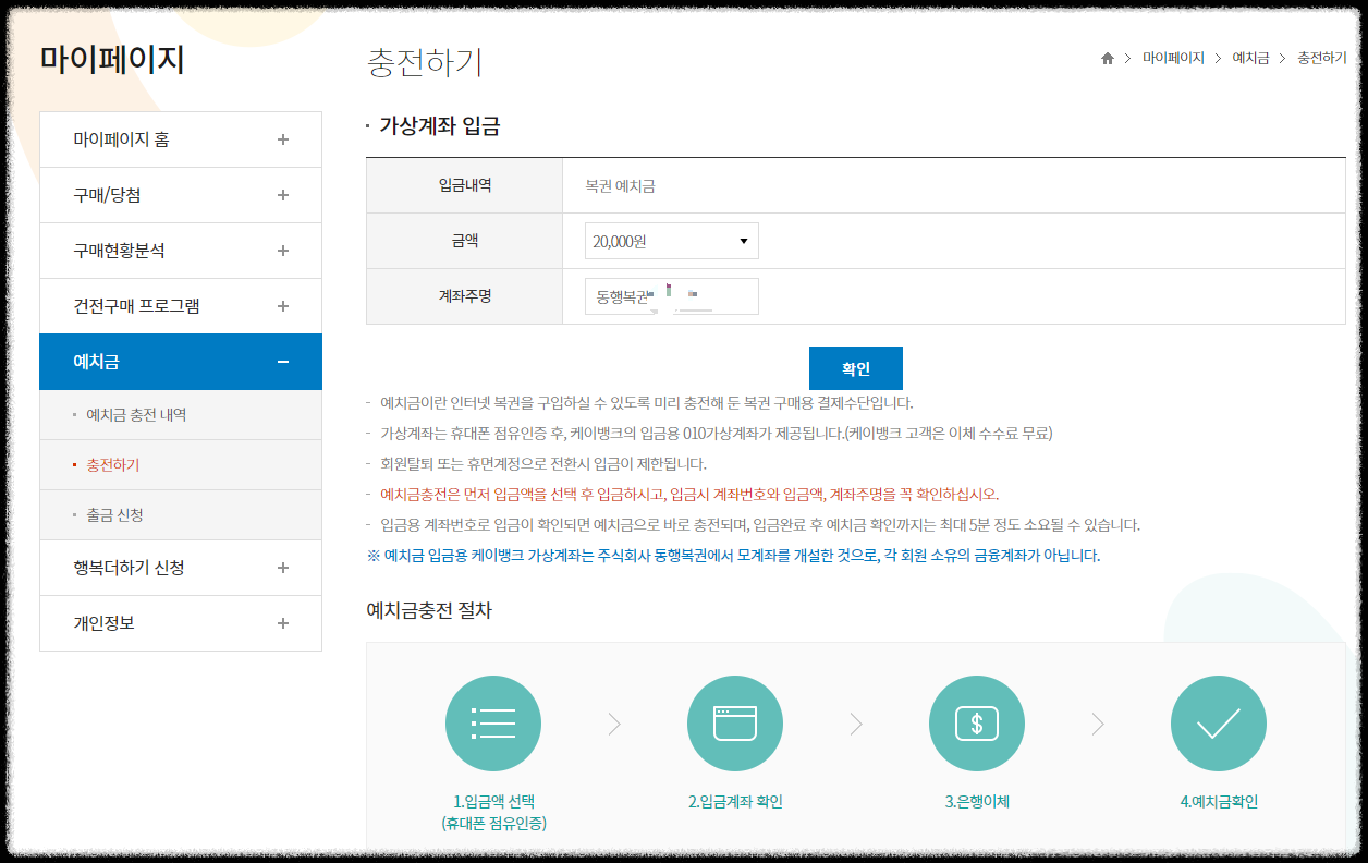 로또 인터넷 구매를 위해서는 예치금을 미리 충전해야 합니다. 충전 버튼을 누르면 충전하기 화면이 보일텐데요. 충전을 진행하면 가상계좌가 주어지고, 그 계좌로 입금을 하면 충전되는 방식입니다.