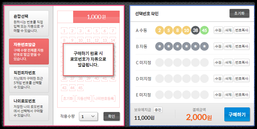 자동번호 발급을 누르면 * 모양으로 보이고, 구매하기를 누르면 최종적으로 번호가 확정됩니다. 이외에 반수동, 반자동 조합으로 구매도 가능하고 지난 주에 샀던 번호로 구매도 가능하니 취향에 맞게 선택하시면 됩니다.