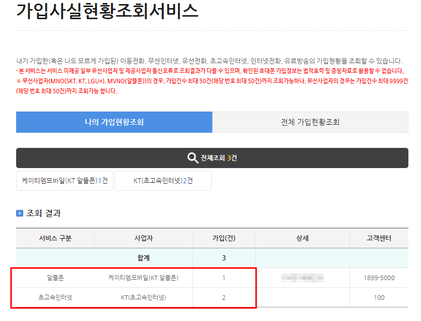 보시는 바와 같이 조회를 하면 바로 확인이 가능한데요. 제 명의로 알뜰폰과 인터넷에 총 3건을 가입한 것을 확인할 수 있었습니다. 만약 조회해보니 내가 가입한 적도 없는 통신서비스에 가입이 되었다면 우측에 보이는 고객센터에 연락해서 해지를 신청하시면 됩니다.