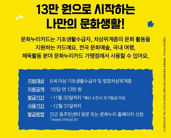 문화누리카드는 단순한 복지 혜택을 넘어 저소득층의 삶의 질을 높이고, 문화적 경험을 확장할 수 있는 소중한 기회입니다. 11월 30일까지 발급 신청을 완료하고, 12월 31일까지 지원금을 알차게 사용해보세요.