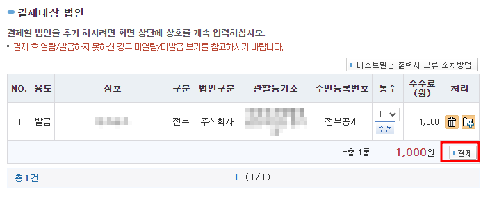 ※ 반드시 발급으로 진행해야 프린트로 출력할 수 있으니, 결제수수료가 1,000원이 아니라면 열람용으로 진행한 것이니 다시 발급 버튼을 누르고 진행하시길 바랍니다.