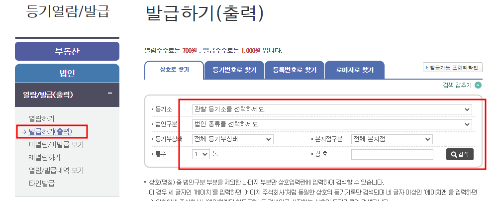 법인등기부등본 발급은 수수료 1,000원이 필요합니다. (참고로 열람수수료는 700원)