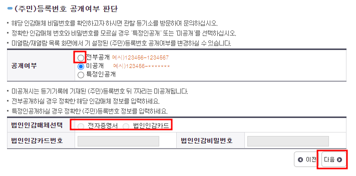 9) 법인인감매체를 선택하고 카드번호, 비밀번호 입력 후 다음 버튼을 누릅니다.