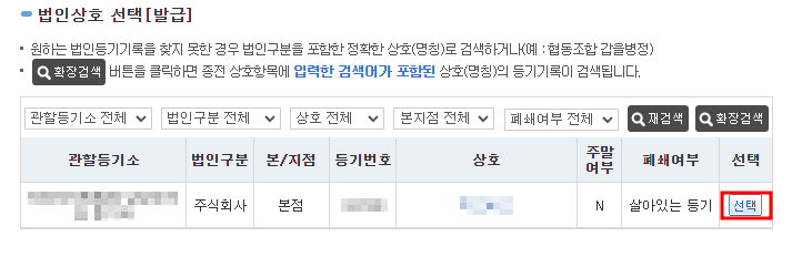 5) 법인 조회 화면에서 선택 버튼을 누릅니다.
