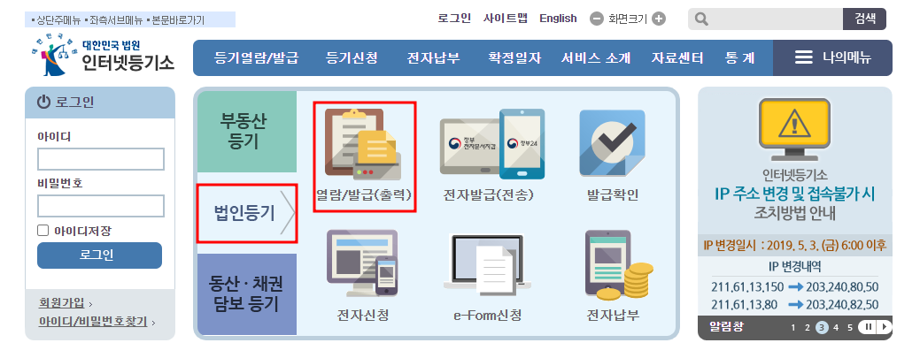 2) 메인 화면에서 법인등기 > 열람/발급(출력)을 클릭합니다.