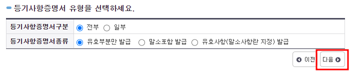 7) 발급할 등기사항증명서 항목을 체크하고 다음 버튼을 누릅니다.