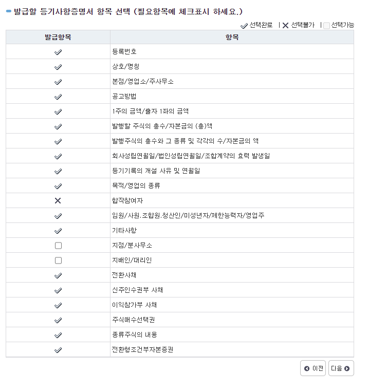 - 전부선택시 : 대부분의 항목이 필수 사항으로 체크되어 있으며, 지점, 지배인/대리인에 관한 사항은 필요시 지정 가능