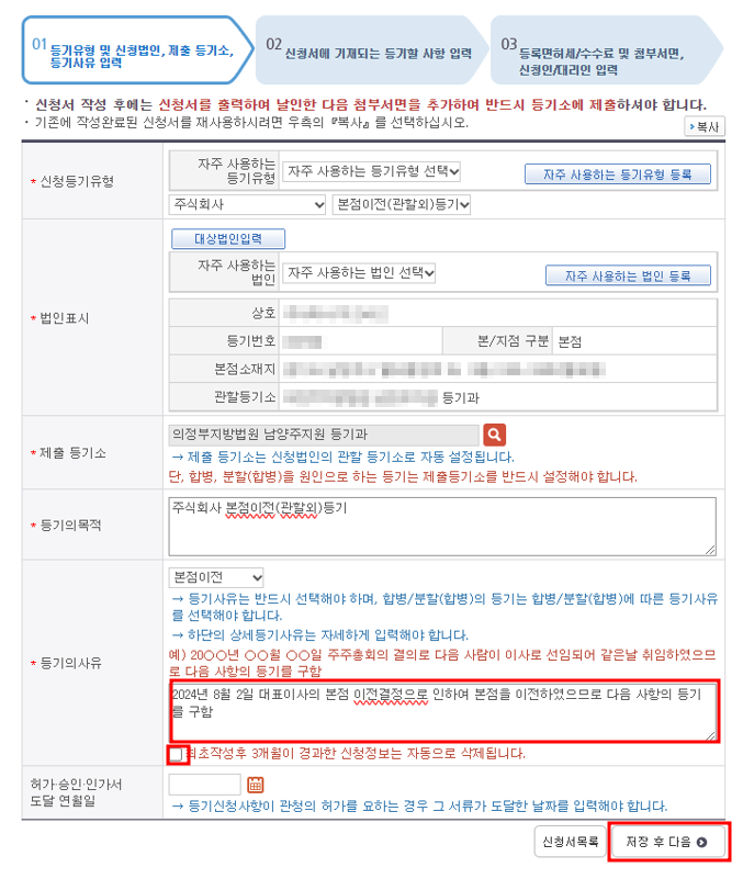4) 등기의 사유를 입력하고 저장 후 다음 버튼을 입력합니다.