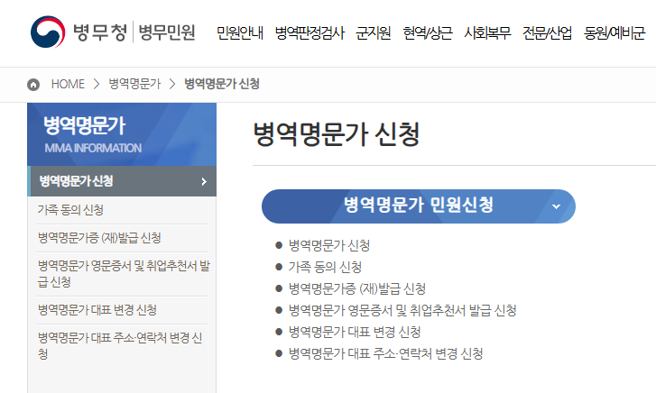 - 병무청 민원포털 > 병역명문가 신청 메뉴 선택.