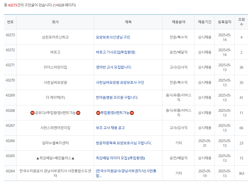 네, 사천시청 구인 게시판은 지역 내 기업들이 수시로 채용 공고를 올리고 있어 일주일에 한두 번 정도는 확인하시는 것이 좋습니다.