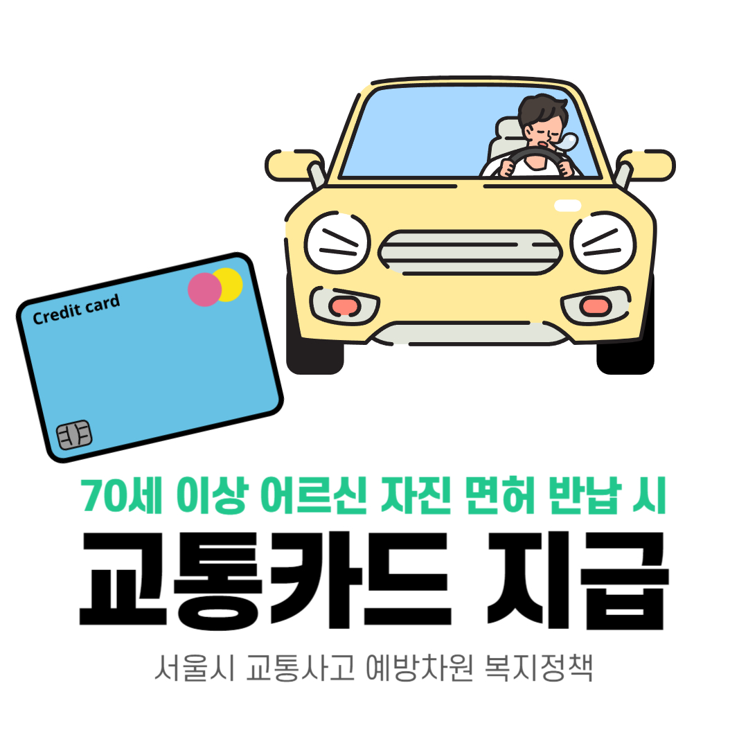 서울시는 고령운전자 교통사고 예방을 위한 목적으로 서울에 거주하는 70세 이상 어르신이 운전면허증을 자진 반납 시, 10만원이 충전된 교통카드를 선착순으로 지급한다는 소식입니다.