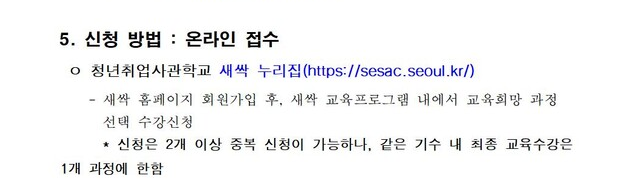 - 신청 방법: 청년취업사관학교 누리집(sesac.seoul.kr)에서 신청