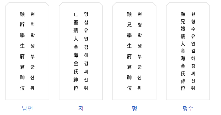 - 예) 남편이 고인인 경우: 顯辟學生府君神位(현벽학생부군신위)