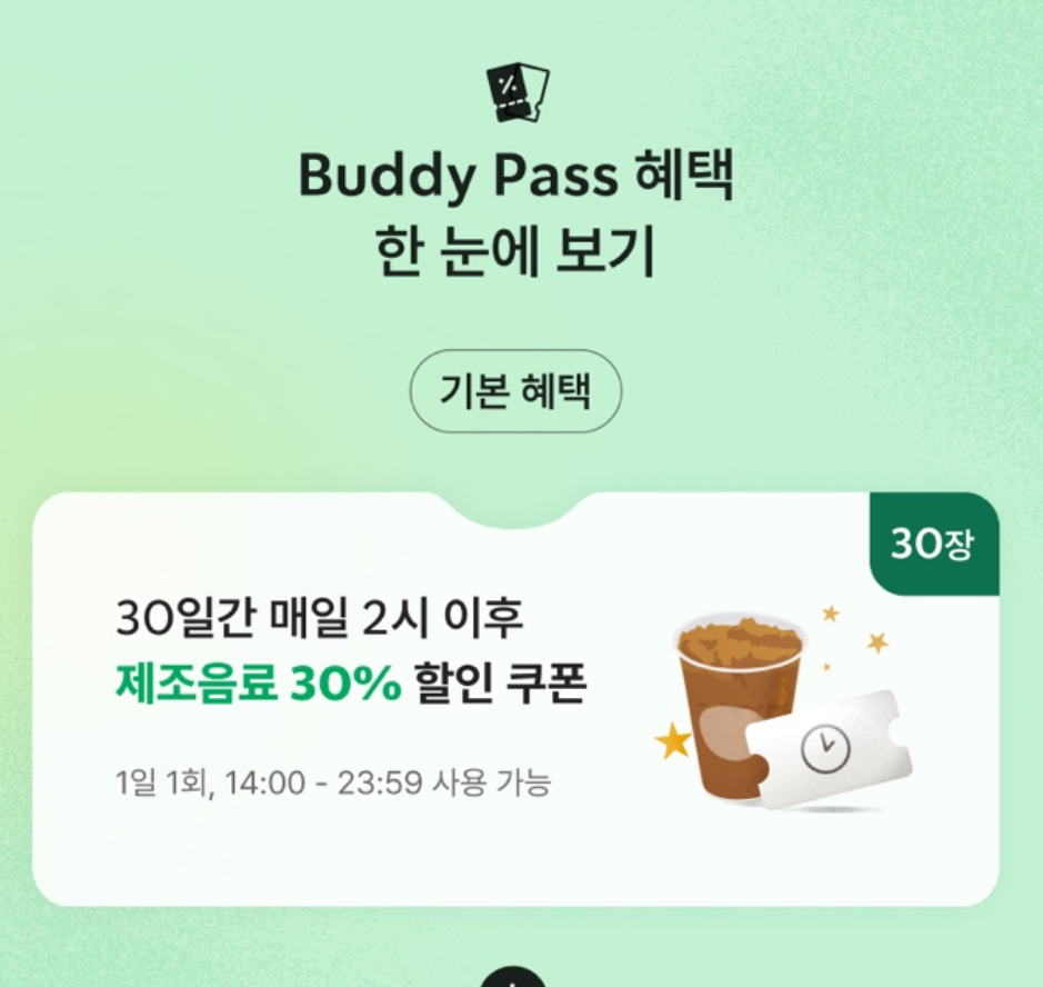 버디 패스를 구독하면 매일 오후 2시 이후 사용할 수 있는 제조 음료 30% 할인 쿠폰이 발급됩니다. 이 쿠폰은 모든 주문 방식(POS, 사이렌 오더, 딜리버스)에서 사용할 수 있으며, 일반 제조 음료를 대상으로 적용됩니다.