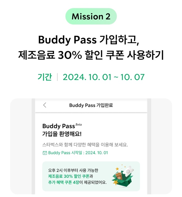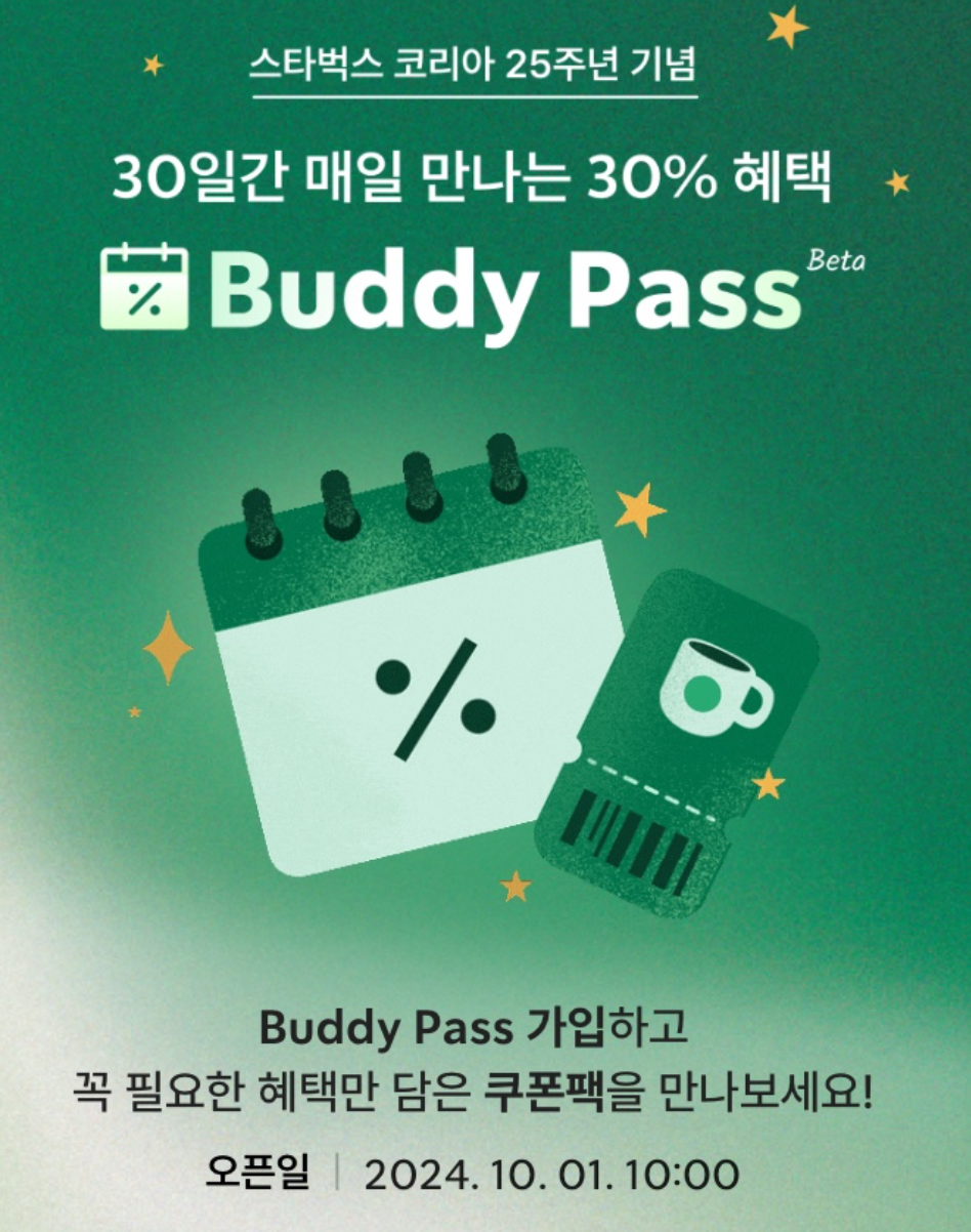 스타벅스 구독 서비스 버디패스 신청을 10월 1일부터 받는다는 소식입니다. 스타벅스 애용자라면 매일 30% 할인 쿠폰을 받을 수 있는 구독 혜택을 놓치지 마시기 바랍니다.