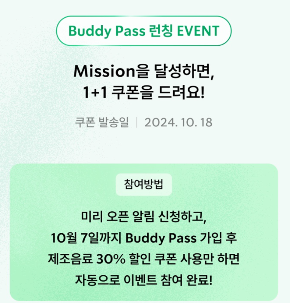 사전 알림을 신청한 후 10월 7일까지 구독 서비스를 신청하는 고객에게는 제조 음료 30% 할인 쿠폰 사용 시, 1+1 제조 음료 쿠폰을 추가로 증정하는 특별 혜택도 제공됩니다.