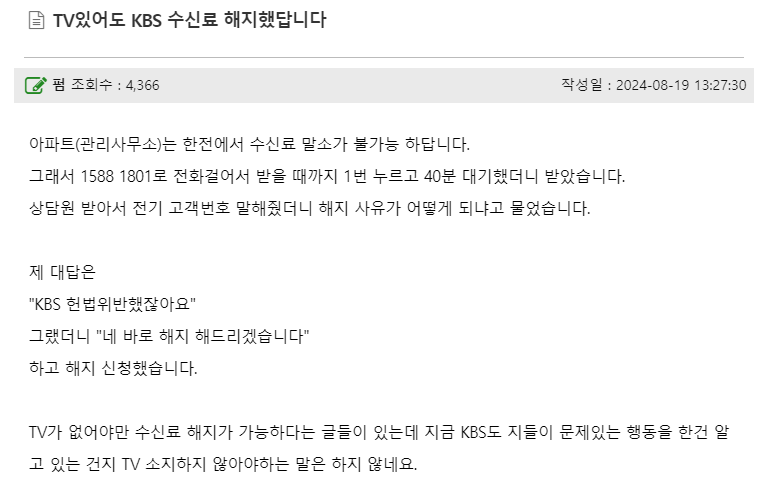 커뮤니티 글 내용에 따르면 상담사에게 해지 사유가 KBS 헌법위반이라고 하니 바로 해지해줬다고 하네요. 그만큼 지금 논란이 되고 있는 문제가 심각한 것으로 보이는데요. 다만 전화받을 때까지 대기하는 시간이 굉장히 오래걸린다는 단점이 있습니다.