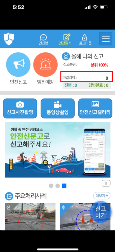 마일리지 조회는 안전신문고 앱을 통해서 조회가 가능한데요. 안전신문고 앱을 실행하고 로그인하면 홈 화면에서 적립된 마일리지를 바로 확인할 수 있습니다.