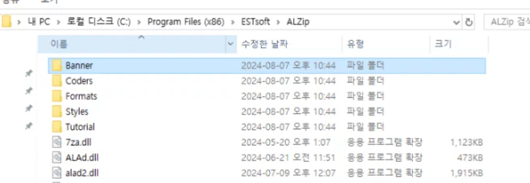 경로: 내 PC > 로컬 디스크(C:) > Program Files (x86) > ESTsoft > ALZip (또는 다른 알툴즈 프로그램 폴더) - ‘Banner’ 파일 삭제하기