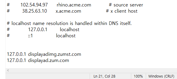 메모장의 맨 아래로 이동하여, 아래 명령어를 추가합니다.- 127.0.0.1 displayadimg.zumst.com