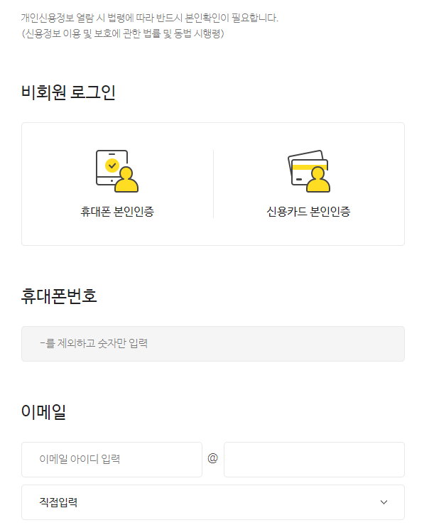 휴대폰, 신용카드 본인인증을 차례로 실행합니다. 이미 회원으로 가입되어 있는 경우에는 자동으로 로그인이 됩니다.