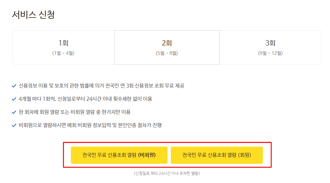 서비스 신청 화면에서 '비회원' 혹은 '회원'으로 신용조회를 시작합니다.