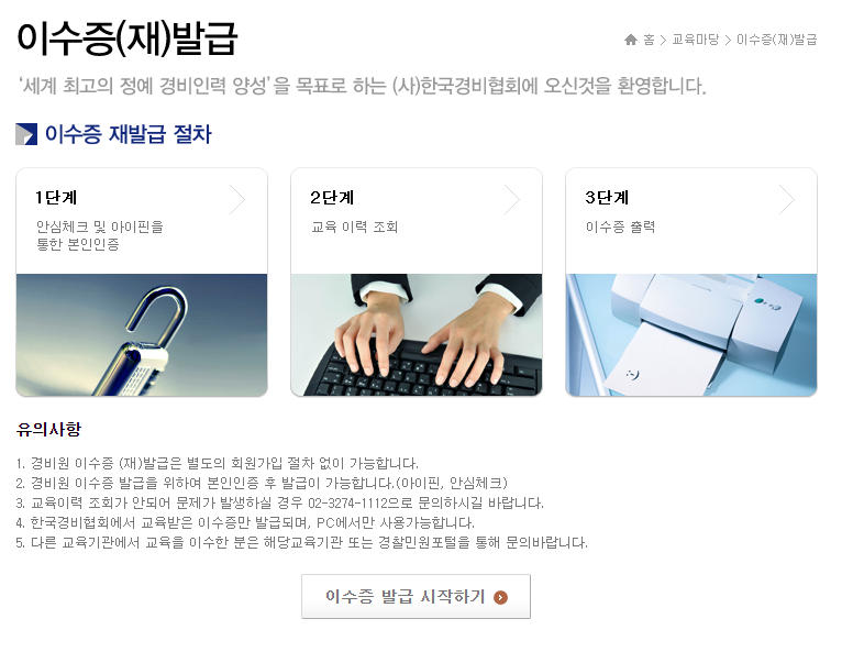 신임교육을 이수하면, 교육 이수증이 발급되며 이를 통해 경비원 자격을 얻게 됩니다.
