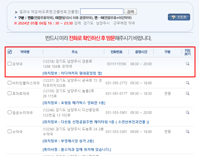 휴일지킴이약국 홈페이지와 다른 결과가 나왔고, 새벽 1시까지 운영하는 약국 위치를 확인할 수 있었습니다.