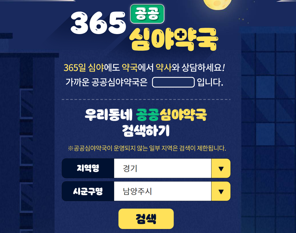 그래서 다른 방법을 찾아보니 대한약사회에서 운영하는 365 공공심야약국이라는 홈페이지를 알게되었습니다. 아래 버튼을 누르면 늦은 밤까지 운영하는 약국의 위치를 확인할 수 있습니다.