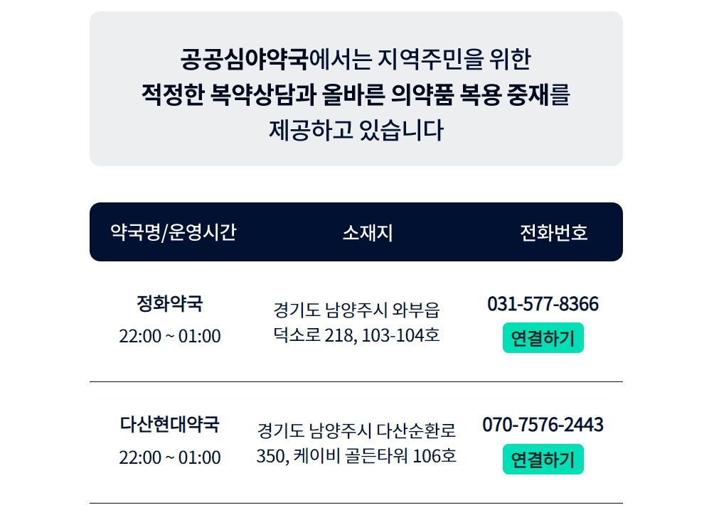 휴일 또는 늦은 밤에 약국에 가야되는 상황이 생겼을 때 이용하면 좋을 것 같습니다.