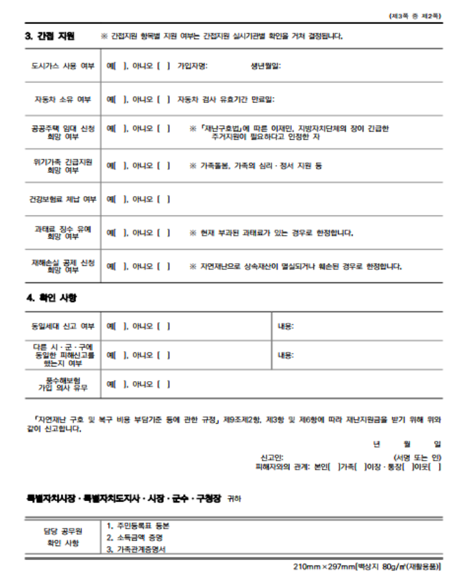 입력할 내용은 피해자 정보, 간접지원, 피해장소, 신고자정보 등이 있습니다. 입력할 정보는 지자체에 직접 방문하여 작성하는 자연재난 피해신고서 양식과 동일합니다.